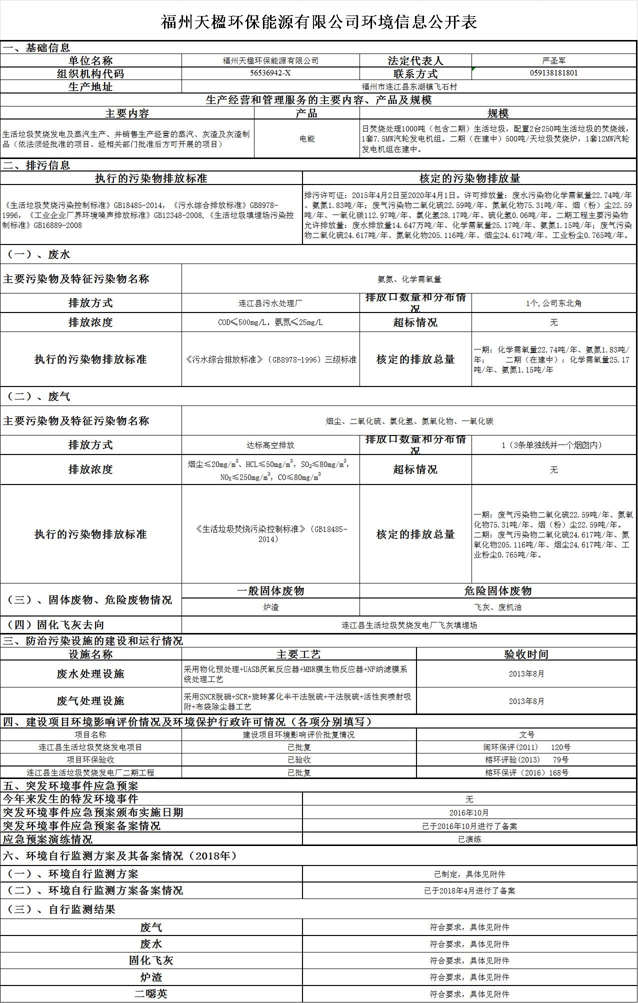 福州天楹環(huán)保能源有限公司2018年環(huán)境信息公開表