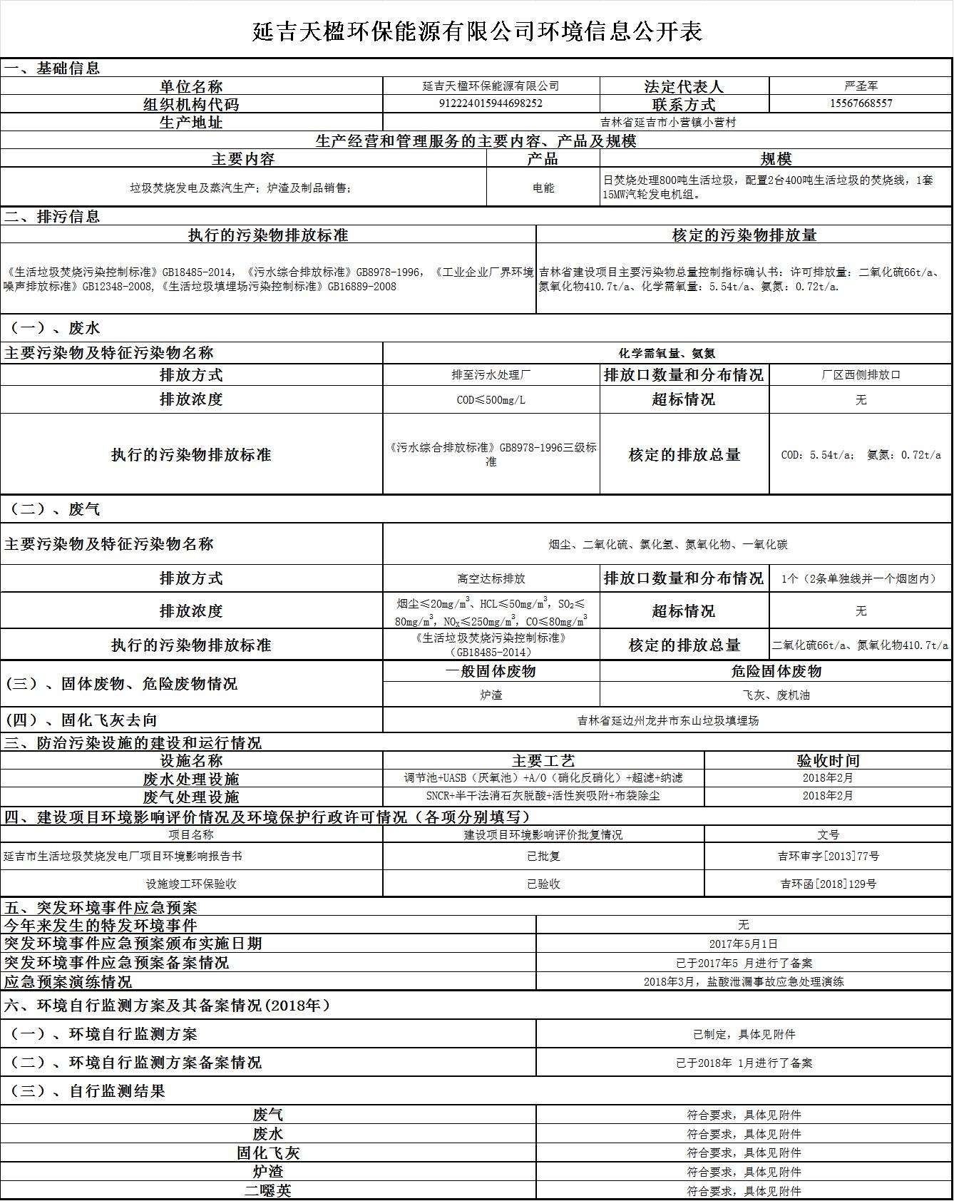 延吉天楹環(huán)保能源有限公司2018年環(huán)境信息公開(kāi)表