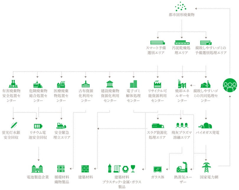 資源循環(huán)利用基地(統(tǒng)合資源リサイクル施設(shè))はスマートシティ構(gòu)築の重要機(jī)能區(qū)畫であり、都市廃棄物管理の精密化レベル向上と廃棄物処理施設(shè)の『NIMBY(Not In My Back Yard)問題』解消に決定的な役割を果たします。